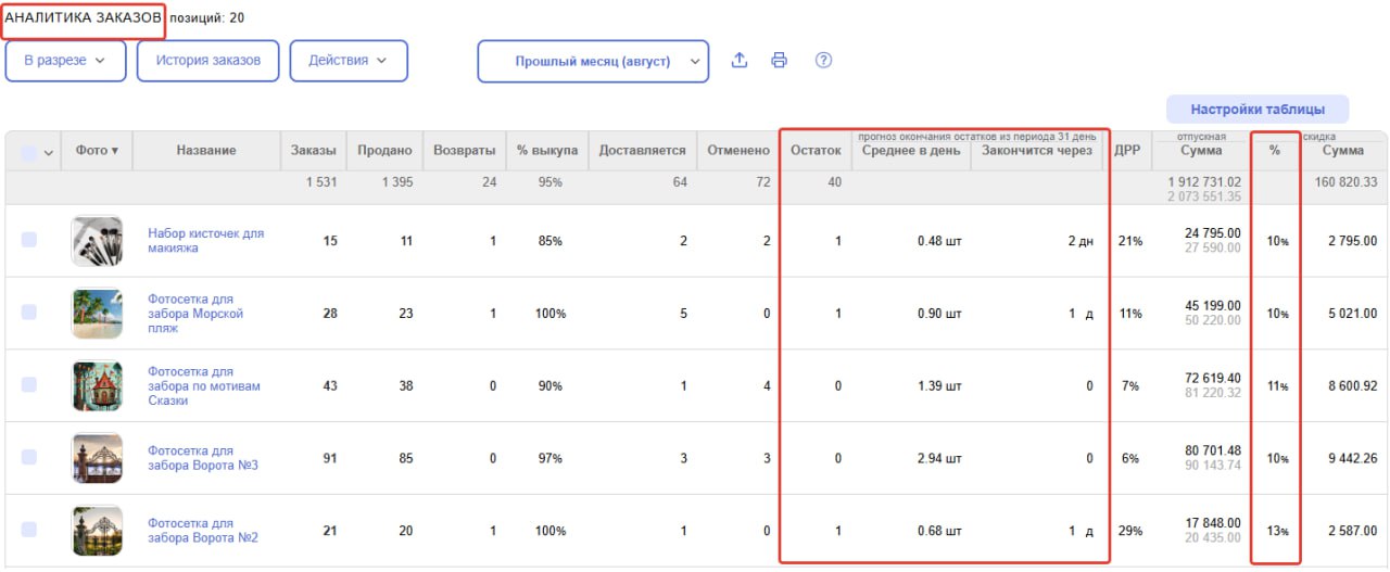 Это поможет пользоваться прогнозом остатков в аналитике заказов.
